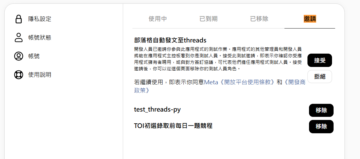 <你的client_secret>則要在剛剛的面板點應用程式 基本資料 Threads 應用程式密鑰